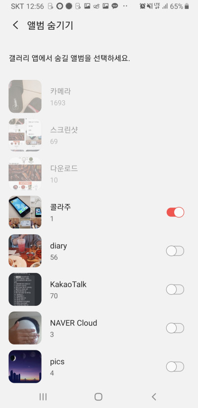그러면 갤러리 앱에서 숨길 앨범을 선택하라고 나오는데 여기서 콜라주 앨범을 숨겨볼까 합니다. 콜라주 옆 활성화를 누르고 밖으로 나오면 콜라주 앨범이 사라져 있는 것을 알 수 있습니다.